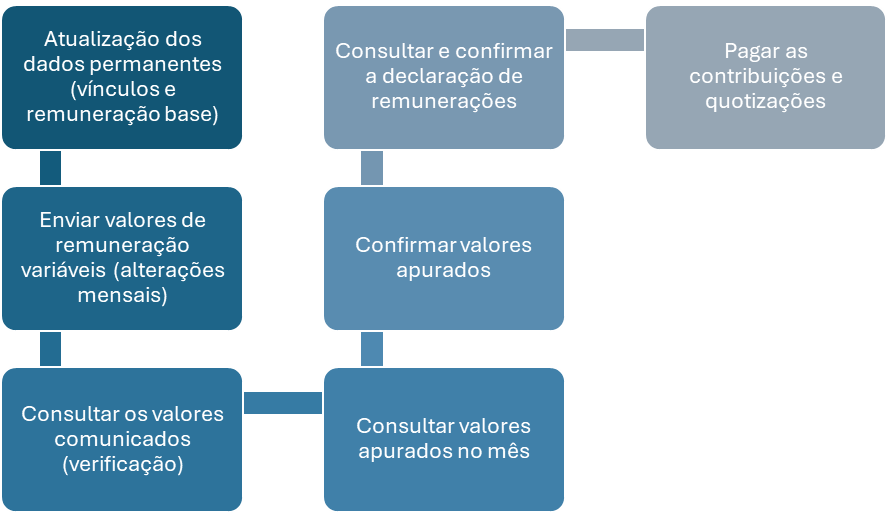 No caso de salário base e diuturnidades, uma vez que são remunerações constantes, e desde que não tenham alterações mensais, serão comunicadas automaticamente pela declaração que será preenchida pela Segurança Social.