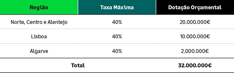 No que toca aos limites e Taxas de Financiamento, são elegíveis os projetos que apresentem um montante mínimo de investimento de 200.000€ (duzentos mil euros).