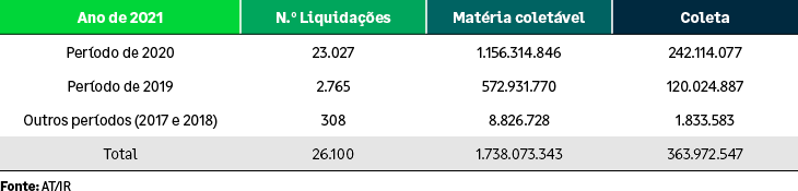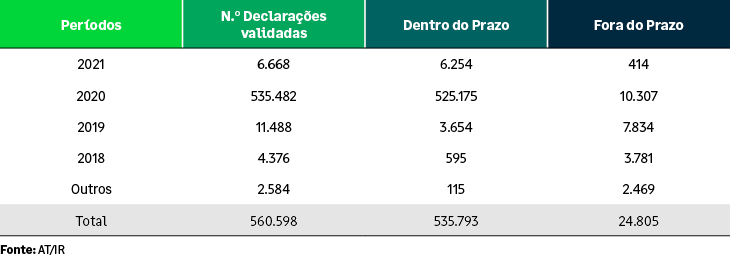Segundo os dados publicados foram recebidas pela ATA, em 2021, 560.968 declarações relativas a vários períodos de imposto, conforme discriminado no quadro seguinte, sendo que apenas cerca de 4%, 24.805 declarações foram entregues fora do prazo. Foram ainda emitidas cerca de 32.761 cartas aviso a contribuintes faltosos da declaração de rendimentos modelo 22 do IRC do período de 2020, para efeitos de regularização voluntária da respetiva obrigação declarativa e pagamento do imposto autoliquidado.