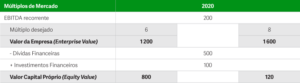 - Ótica do Mercado: É a mais utilizada no âmbito das Fusões & Aquisições, espelhando a forma como a empresa é vista pelo mercado. Recorre a bases de dados de transações nacionais e internacionais comparáveis nos diversos setores de atividade, permitindo obter múltiplos médios de mercado posteriormente aplicados aos indicadores de rentabilidade da Sociedade (normalmente, EBITDA, EBIT ou vendas) permitindo obter o Enterprise Value (valor da empresa). Deduzindo-se a dívida financeira e somando Caixa e investimentos financeiros, é calculado o Equity Value (Valor para os acionistas).Exemplo: